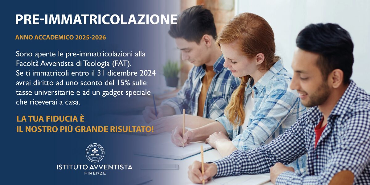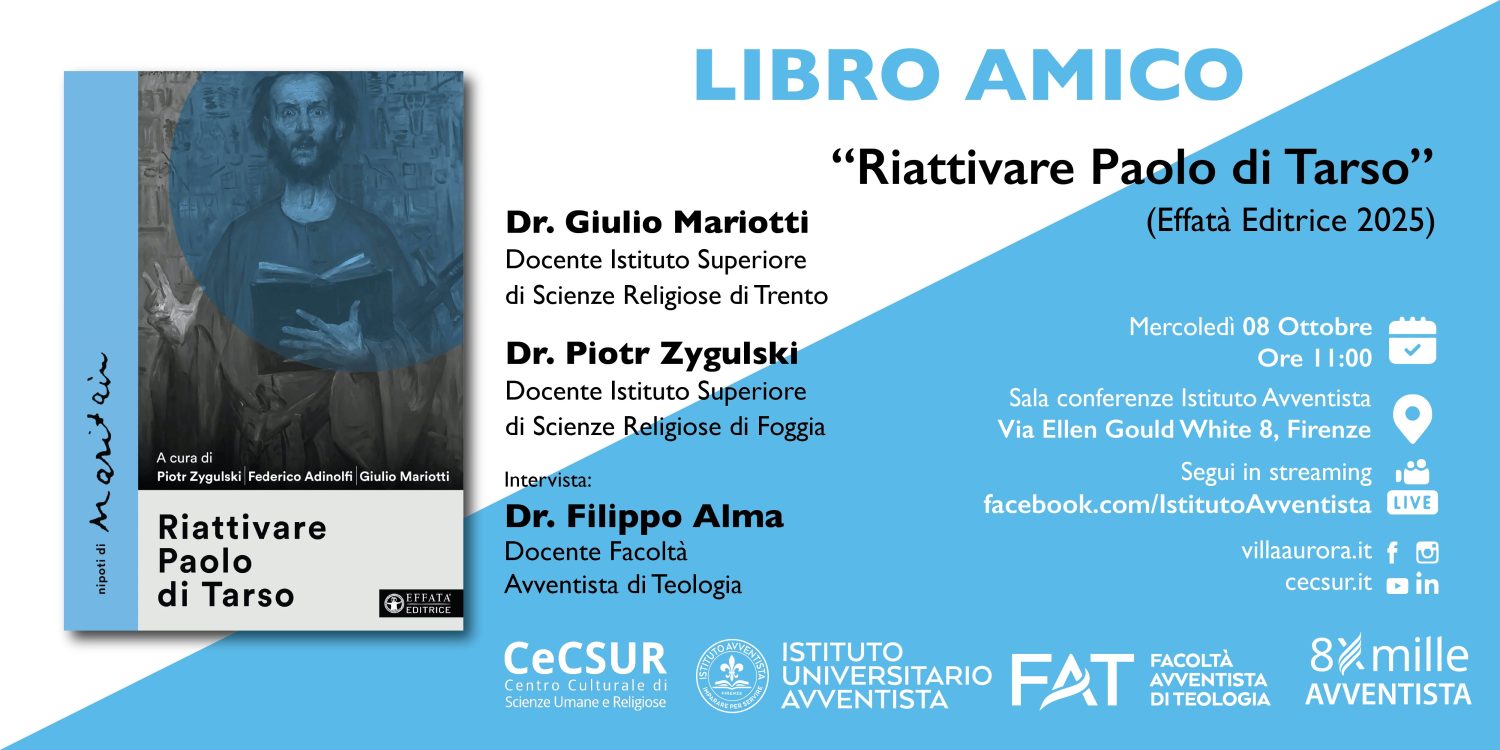 Venerdì 24 ottobre alle ore 11:00, nella sala conferenze dell’Istituto Avventista di Cultura Biblica “Villa Aurora” (via Ellen Gould White 8, Firenze), si terrà un nuovo appuntamento
