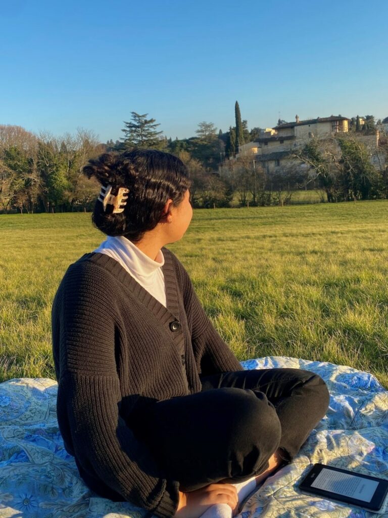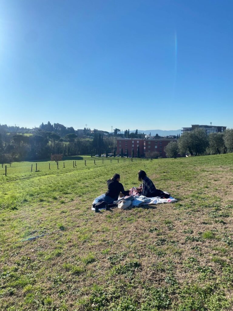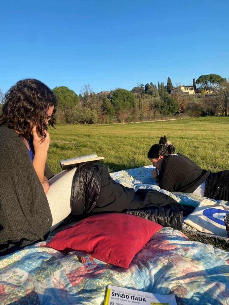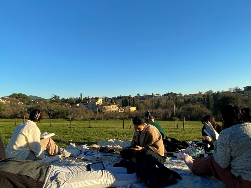 Dopo mesi trascorsi troppo a lungo al chiuso, il mondo esterno era diventato il nostro rifugio in pochi giorni. Il nostro piccolo gruppo di quattro “raccoglitori di sole” si era presto trasformato in una piccola tribù di più di otto adoratori del sole. Per un breve periodo, ci chiamammo scherzosamente — ma con un certo orgoglio — “Ninfe toscane”. Quelle coperte logore sembravano un rifugio dal resto del mondo. Su di esse erano nate nuove passioni. Ogni giorno trascorreva placidamente sotto la promessa del sole caldo, e sembrava infinito. Così infinito da permettere di leggere un numero sconfinato di libri. Infinito abbastanza da annotare ogni pensiero che ci passava per la mente. Infinito a sufficienza da creare così tanta arte da poter tappezzare una parete. Infinito da far posto a ogni cosa che un tempo avevamo considerato secondaria, e che ora trovava spazio in cima alle nostre priorità.