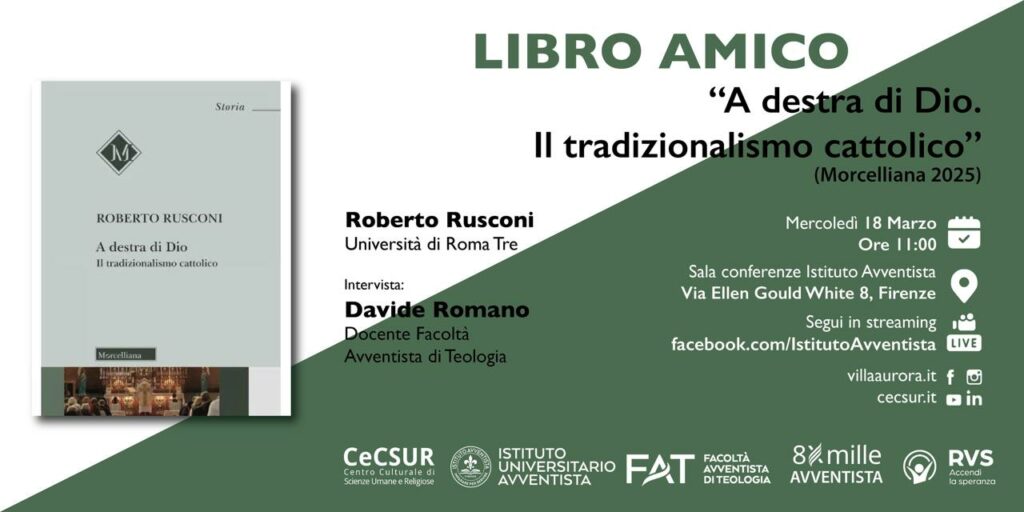 Durante l’incontro l’autore dialogherà con Davide Romano, docente della Facoltà Avventista di Teologia, offrendo al pubblico l’opportunità di approfondire uno dei temi più discussi nel panorama religioso contemporaneo: il tradizionalismo cattolico.